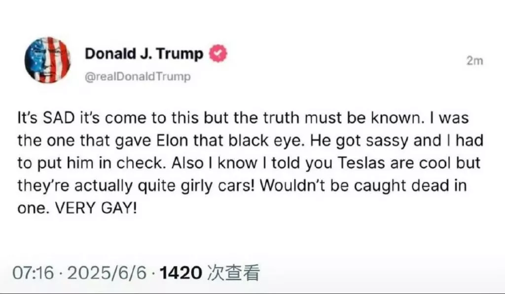 6月3日,特朗普在他的社交平台上回怼,说马斯克是因为拿不到补贴才不爽,还放话要砍掉SpaceX和Starlink的政府合同。