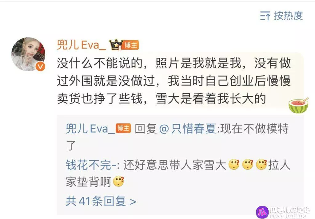 与许多被曝光的网红不同,兜儿Eva_的处理方式引起了公众的关注和赞扬。面对这次争议,兜儿Eva_并没有采取常见的回避或否认策略,比如声称照片被PS或是选择沉默,而是非常坦率地承认了照片中的人确实是她本人。这种直面争议的态度在娱乐圈和网红界相对罕见。