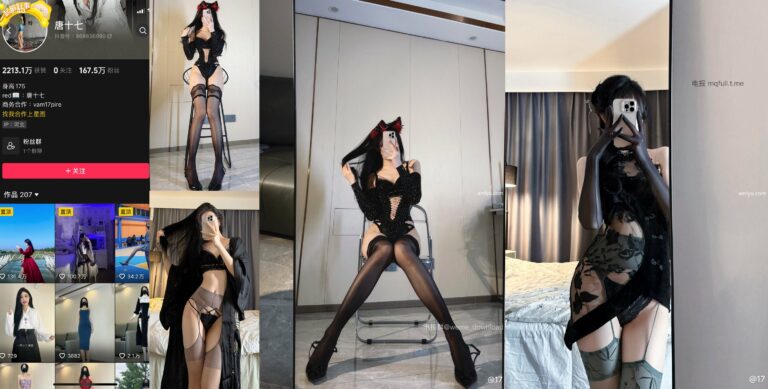 在这一期的微密圈专辑中,唐十七以一身魅力四射的黑色装扮再次惊艳登场。她身穿一件黑色亮片网眼装,完美展现了她的曼妙曲线,性感的镂空设计恰到好处地勾勒出她的每一寸肌肤。黑色高腰内裤与黑色吊带袜的搭配,瞬间提升了挑逗与神秘的氛围,而那双修长美腿与高跟鞋更是让她的造型如同魅影般令人神魂颠倒。