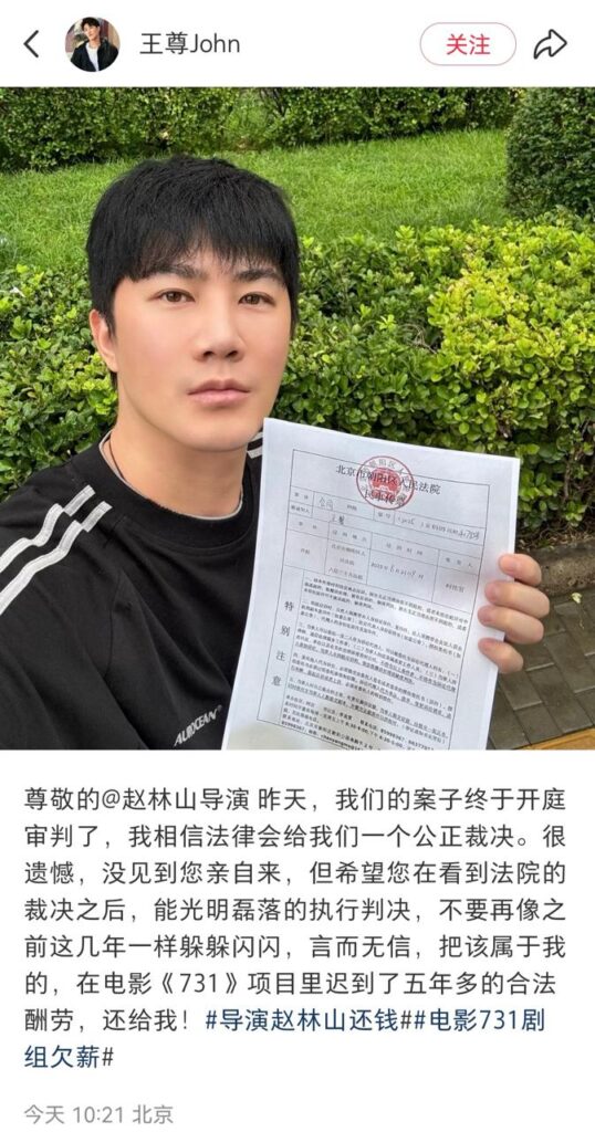 内地电影《731》演员王尊,突然发文指责《731》剧组多次欠薪,其本人声称,在电影拍摄阶段,剧组曾多次遇到停工以及资金问题,是他始终支持导演赵林山完成这部电影,没想到换来的却是被除名以及高达70万元的薪资欠款。