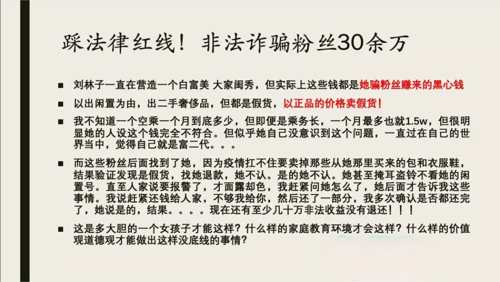 东航上海乘务三部的乘务长刘林子,小红书上的网红空姐,细心打造了一个完美的女神形象,但是被男友爆料在恋爱期间与多名男性维持不当关系,并涉嫌诈骗粉丝超过30万元,最终被其男友揭发。