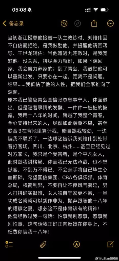 cba青岛国信男篮主教练刘维伟被妻子发文举报婚内出轨有夫之妇