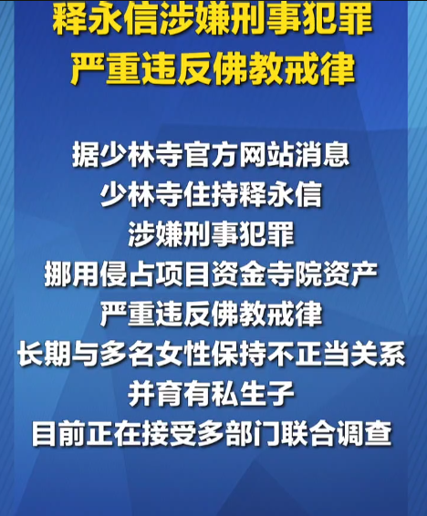 少林寺住持释永信因涉嫌刑事犯罪而受到关注,具体指控包括挪用和侵占项目资金及寺院资产。此外,他还被指责严重违反佛教戒律,长期与多名女性保持不正当关系,并育有私生子。