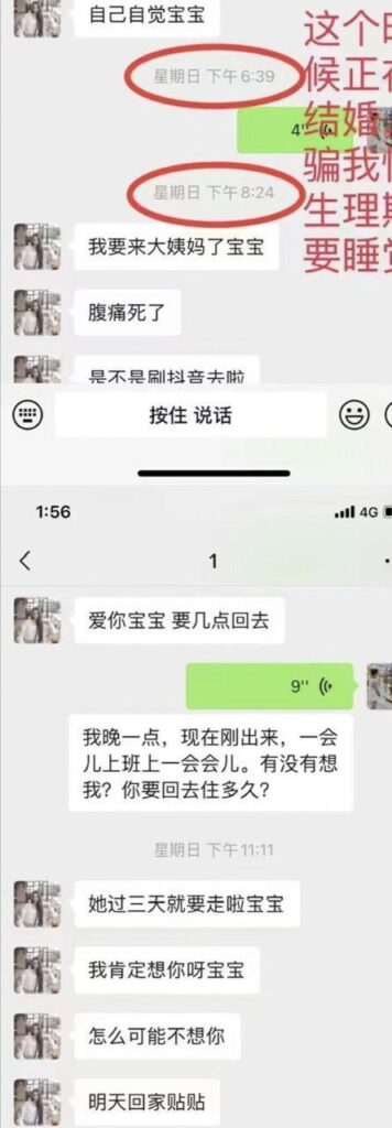 福建德化一名女子张丽琼被指同时与两人交往。她对与自己同居一年的男友谎称“来例假,需要回家几天休息”,实际上却在此期间与他人举行了婚礼。男友在看到那段婚礼视频后当场崩溃。事后有人称,她利用“来例假要回家几天,三天后再回来陪你”的说辞掩盖真实行程,最终背着男友完成了婚礼。