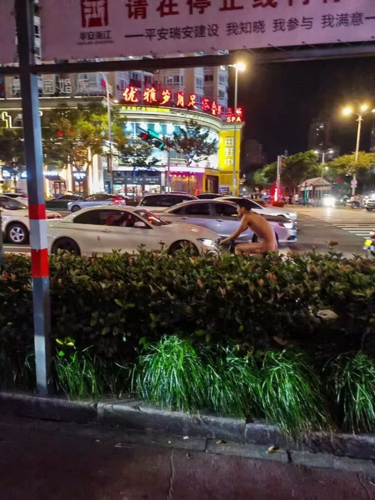 骑行界的达人们的玩法越来越离奇了。就在浙江瑞安吾悦广场的一个宁静夜晚,突然出现了一位全身赤果的男子,骑着山地车穿梭于步行街上,丝毫不在意周围的目光。诚然,骑行圈的发展真是越来越怪异了。